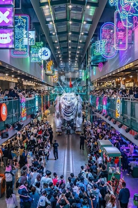 熊洞街是一個由4800平方米廢棄工業(yè)廠房改造的沉浸式IP樂園,樂園里有巨獸巡游、時尚文創(chuàng)、科技研學、特色美食等元素,用文化、科技、藝術結(jié)合的方式,打造了一個“尖叫地標”,并通過“巨熊北北”這個超級IP,把文旅和商業(yè)業(yè)態(tài)有機融合在一起。