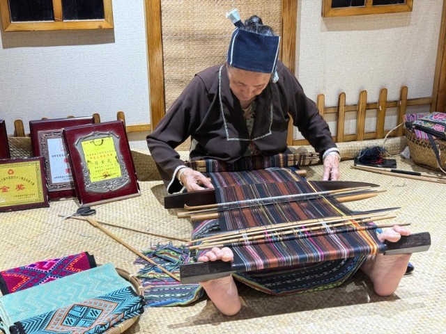2025年6月24日,海南檳榔谷黎苗文化旅游區(qū)里,黎族阿婆符金花正在織黎錦。新華社記者李玥 攝