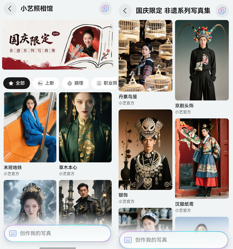 另外,對于想拍文化感滿滿的國風(fēng)影像的用戶,小藝照相館Agent上線了國慶限定非遺系列模板,進(jìn)入小藝App>右下角發(fā)現(xiàn)>智能體>小藝照相館后,在國慶限定專區(qū)選擇喜歡的模板,然后就可按步驟生成高質(zhì)量的國風(fēng)寫真,打造專屬非遺系列寫真紀(jì)念冊。
