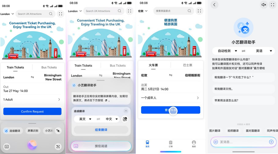 當(dāng)然,小藝的能力遠(yuǎn)不止于此。海外出行時(shí),用戶翻閱外文網(wǎng)站或使用外文App,只需長按屏幕底部小藝導(dǎo)航條,點(diǎn)擊“連續(xù)翻譯”,或直接喚醒小藝后說“連續(xù)翻譯”,即可體驗(yàn)邊瀏覽邊翻譯的效果。當(dāng)需要與外國友人進(jìn)行面對面溝通時(shí),使用小藝的面對面翻譯幫你輕松應(yīng)對跨語言溝通場景;遇見不認(rèn)識的外文路牌、菜單,拍照發(fā)給小藝翻譯助手秒翻譯。
