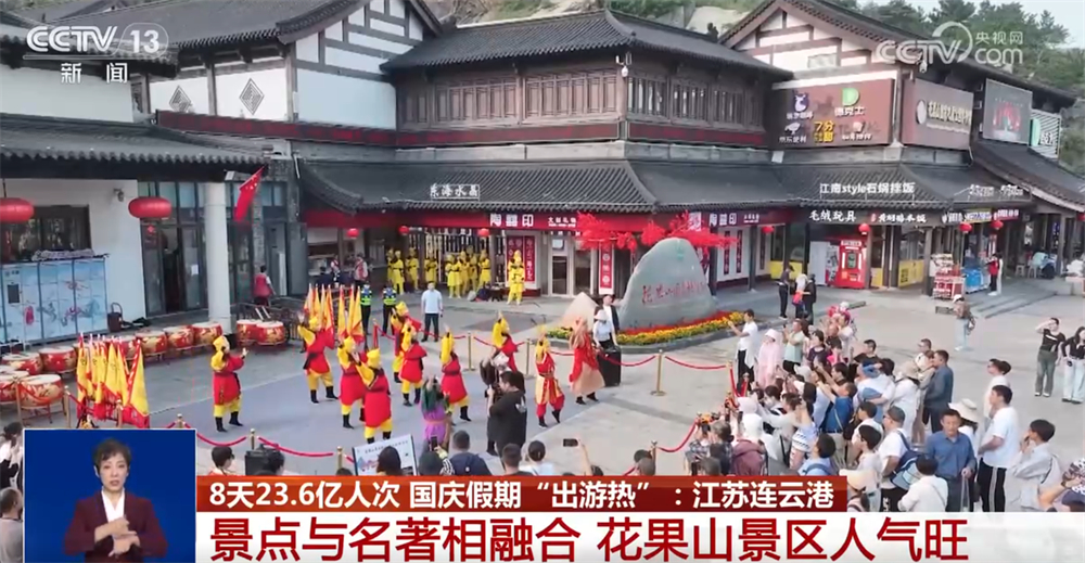 沿著蜿蜒山路,游客們拾級而上,走進(jìn)“水簾洞”登上“玉女峰”,感受藍(lán)天如洗、白云舒展的豪邁。不少游客還在山頂揮舞國旗,慶祝共和國生日;ü骄皡^(qū)將景點與名著深度融合,為游客準(zhǔn)備了取材自《西游記》精彩片段的情景演出,分布在游客上山的途中,精彩節(jié)目輪番登場,為游客營造出熱鬧喜慶氛圍。