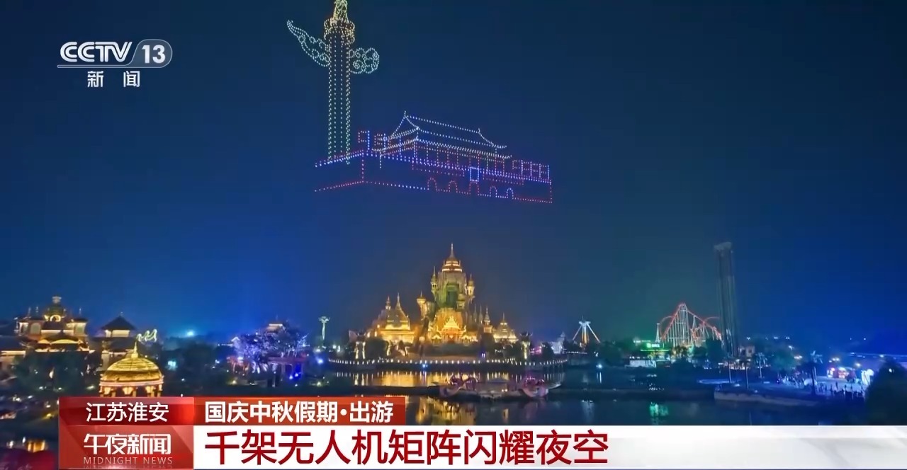 夜幕降臨,在江蘇淮安西游樂園,1600架無人機(jī)同步升空,組成“我愛你中國”、天安門、璀璨中國等造型圖案,科技與光影的碰撞,譜寫了一曲璀璨奪目的 “空中詩篇”。全新升級的“國慶煙花大會”更是將現(xiàn)場氛圍推向高潮。絢爛的煙花與水幕交織相映,形成了一幅立體畫卷,營造出了既浪漫又熱烈的節(jié)日氛圍。