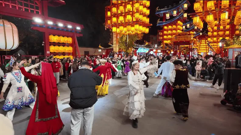 游客們在盛世華疆·八卦城之夜街區(qū)載歌載舞,感受節(jié)日濃厚氛圍 (曾琳博 攝)