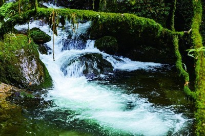 這樣云水相依的奇景屬實(shí)難得。瓦屋山位于華西雨屏帶腹地,降水充沛,山頂108個(gè)泉眼源源不斷,匯聚成72條瀑布,沿層理分明的陡崖梯級(jí)跌落,形成了世界罕見的高山群瀑奇觀。待到數(shù)九隆冬,瀑布便收起雷霆之勢,轉(zhuǎn)而凝結(jié)成千姿百態(tài)的冰瀑,讓人一睹冰雪奇觀。