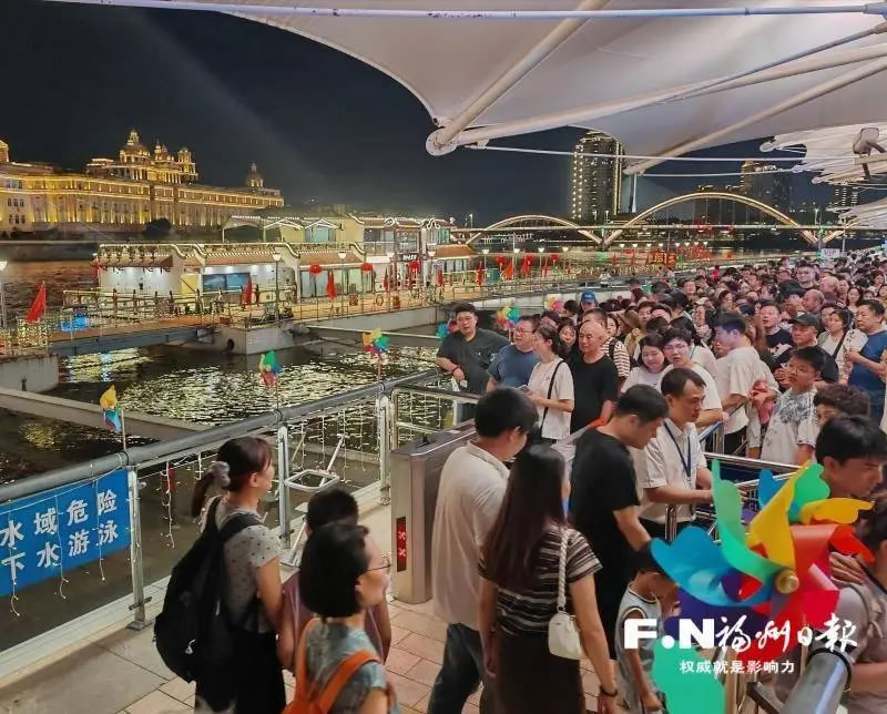 國慶中秋假期,閩江夜游游客流量大增,等待上船的游客排起長隊(duì)。(八方客運(yùn)公司供圖)