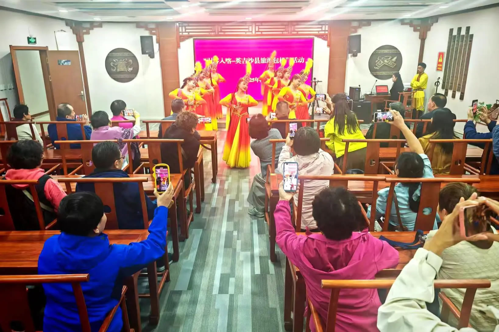 在英吉沙縣國學(xué)書院舉行的歡迎儀式上,縣文工團(tuán)的演員們載歌載舞歡迎遠(yuǎn)道而來的客人,游客與演員們熱情互動(dòng),共同起舞,在歡快的舞步和熱烈的氛圍中拉近距離、增進(jìn)了解。隨后,大家參觀了縣國學(xué)書院,體驗(yàn)國家級(jí)非物質(zhì)文化遺產(chǎn)——模戳印花布制作工藝,感受傳統(tǒng)文化的魅力。