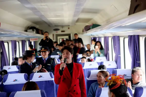 火車上,《和田是個(gè)好地方》《新疆姑娘》《祝福祖國(guó)亞克西》等經(jīng)典文藝節(jié)目輪番上演,悠揚(yáng)的旋律和深情的演唱打動(dòng)著在場(chǎng)的每一位旅客,讓車廂成為流動(dòng)的舞臺(tái)。文藝表演結(jié)束后,文旅資源宣傳推介環(huán)節(jié)緊隨其后,工作人員通過生動(dòng)講解與展示,帶領(lǐng)旅客提前領(lǐng)略和田的獨(dú)特風(fēng)光與人文魅力。此外,宣講人員還用接地氣的家常話、互動(dòng)感十足的小問答,把理論知識(shí)講得鮮活有趣,讓旅客們?cè)诼猛镜乃槠瑫r(shí)光里,既能放松休憩,又能輕松收獲思想啟迪,讓出行多了一份別樣的“精神補(bǔ)給”。