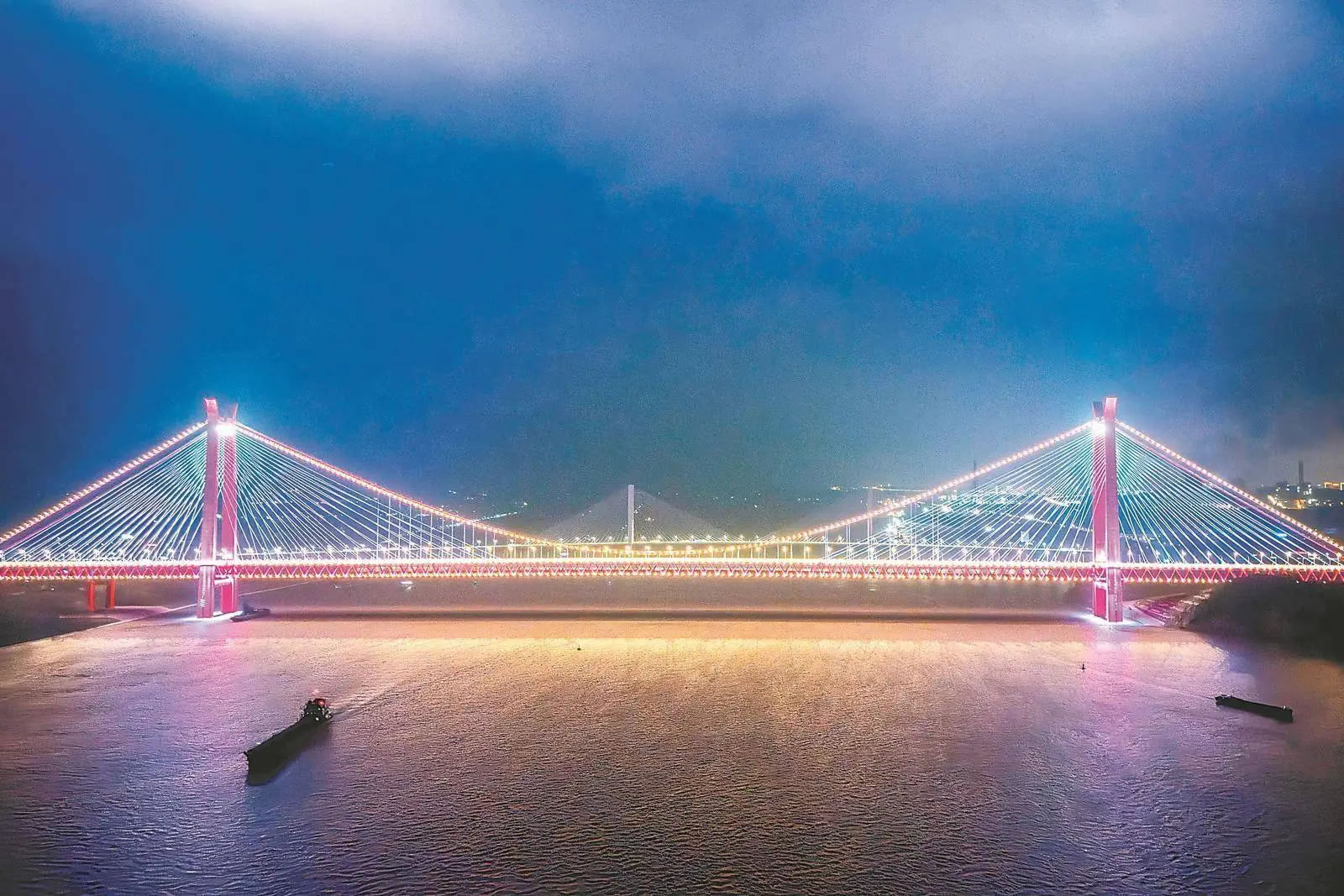 10月21日晚,銅陵長江三橋燈光璀璨。夜景照明工程技術人員已完成亮化設施安裝調試,正在對燈光效果進行最終優(yōu)化。據了解,該橋梁夜景照明工程范圍為跨江公鐵合建主橋,總長1505米,安裝了3000余盞燈具。當夜幕降臨,大橋化作江面的“光影長虹”,成為一道嶄新的風景線。(儲著傳 攝)