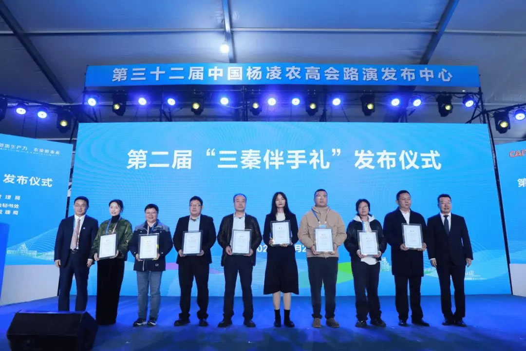 第二屆50款“三秦伴手禮”優(yōu)選產品名單在現(xiàn)場發(fā)布。陜西省市場監(jiān)管局黨組書記、局長張小平與楊凌示范區(qū)管委會副主任程津慶共同為獲獎企業(yè)代表授牌。