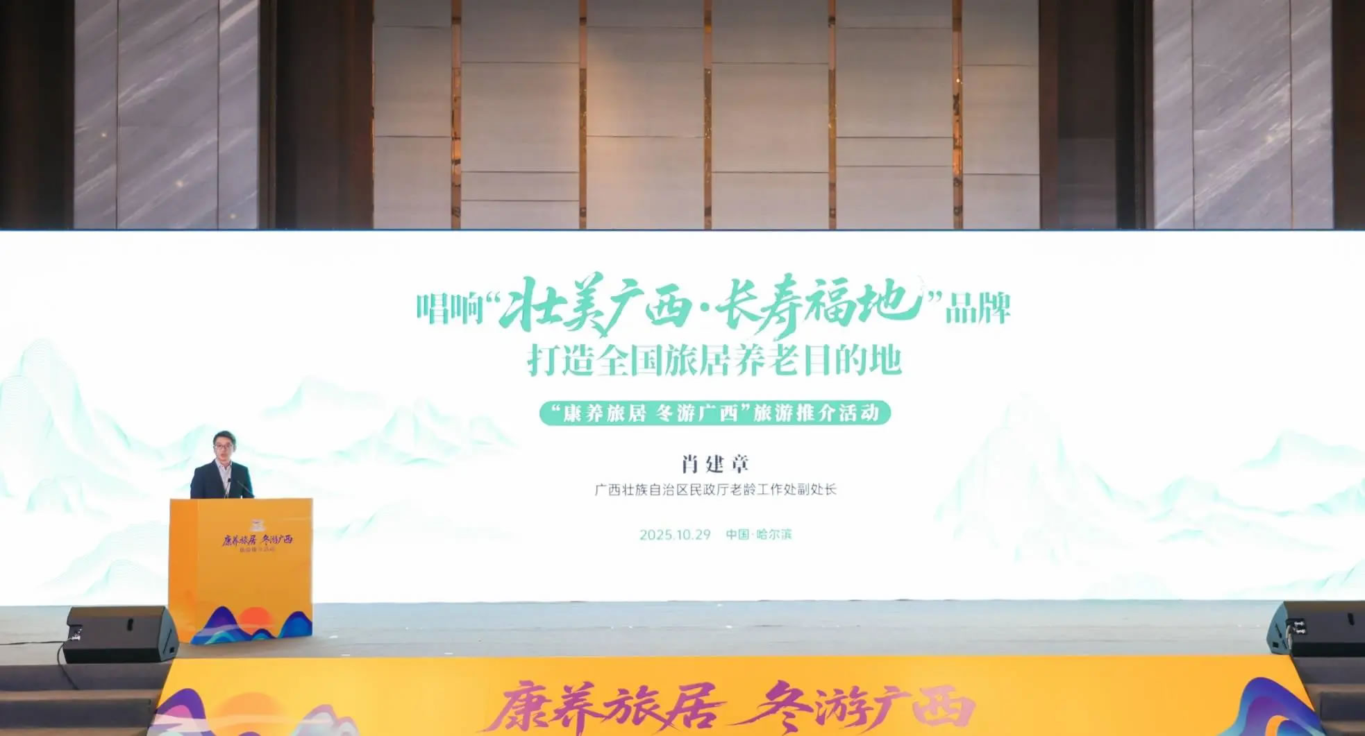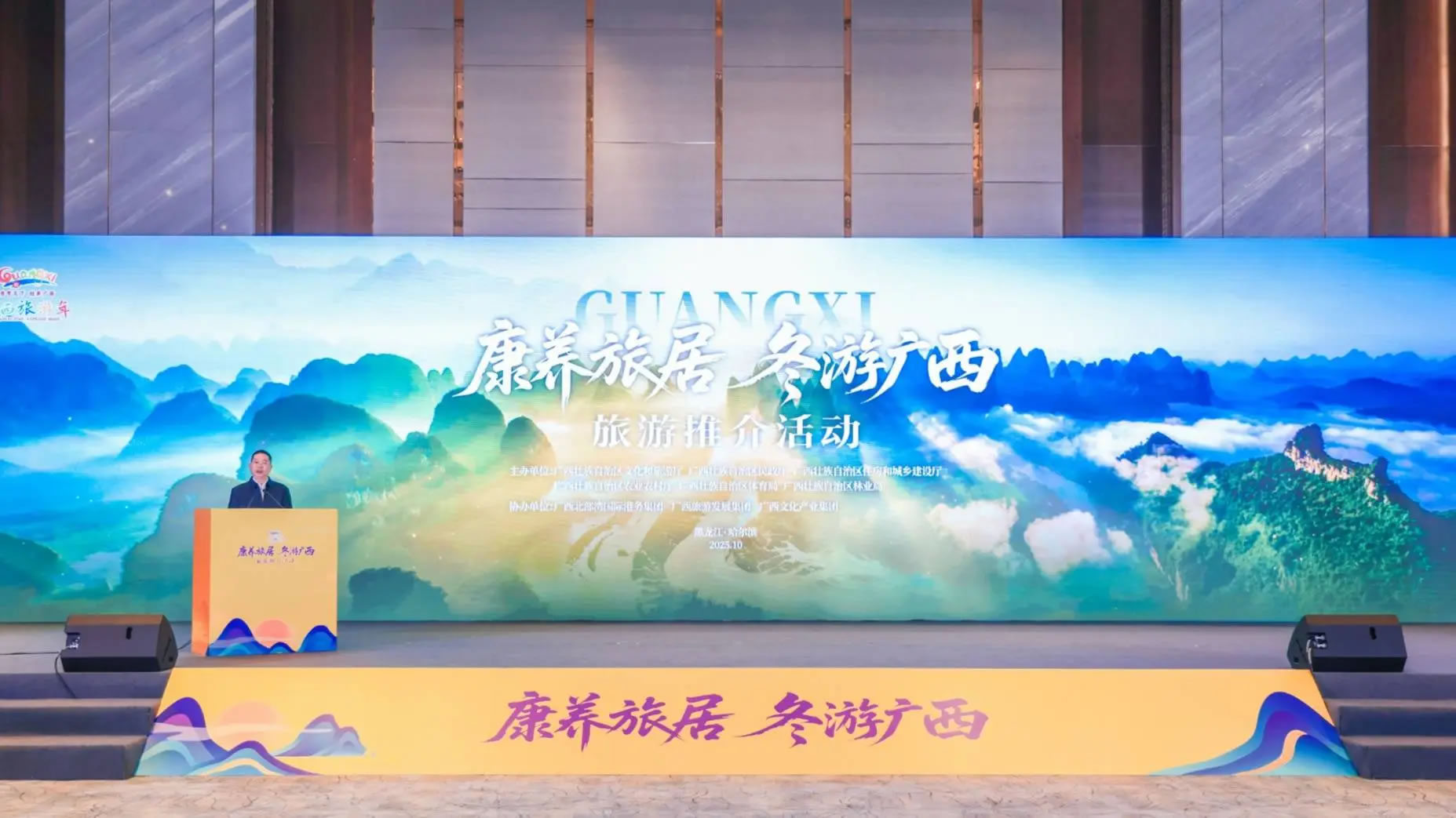 10月28日-29日,由廣西壯族自治區(qū)文化和旅游廳、民政廳、住房城鄉(xiāng)建設廳、農(nóng)業(yè)農(nóng)村廳、體育局、林業(yè)局共同主辦的“康養(yǎng)旅居 冬游廣西”旅游推介活動在哈爾濱市舉辦。
