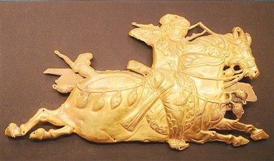 吐蕃騎射武士形飾牌造型威武,動(dòng)感十足,格外引人注目。騎者纏頭巾,頭巾下方兩條發(fā)辮隨風(fēng)飛舞,雙目圓瞪,嘴下有濃密的絡(luò)腮胡須;身穿緊身三角形大翻領(lǐng)長袍,雙手拉弓欲射,腰部系帶,其上垂掛箭囊,腰后露出刀柄。馬尾打有結(jié)扣,杏葉凌空飛動(dòng),氣勢(shì)撼人。金飾牌背面殘存帶黑漆皮的薄木片,上面有金釘將飾牌與木片定綴在一起,可知此飾牌原來應(yīng)為某件木質(zhì)器皿上的裝飾物。“這件飾牌的造型受到西亞薩珊王朝金銀器上的帝王狩獵圖影響,而騎士的裝束卻是吐蕃風(fēng)格,體現(xiàn)了文化的交融。”趙婧說,青海省都蘭縣熱水墓群出土了相似的騎射形金飾片,亦為吐蕃時(shí)期的器物。