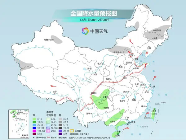 具體來看,中央氣象臺預(yù)計,今天,內(nèi)蒙古中部、黑龍江南部、吉林、新疆沿天山地區(qū)、河北北部等地部分地區(qū)有小雪或雨夾雪。湖南西南部、西南地區(qū)東部、廣西中東部、廣東西南部、海南島、臺灣島等地部分地區(qū)有小到中雨,其中,海南島東南部等地部分地區(qū)有大雨。