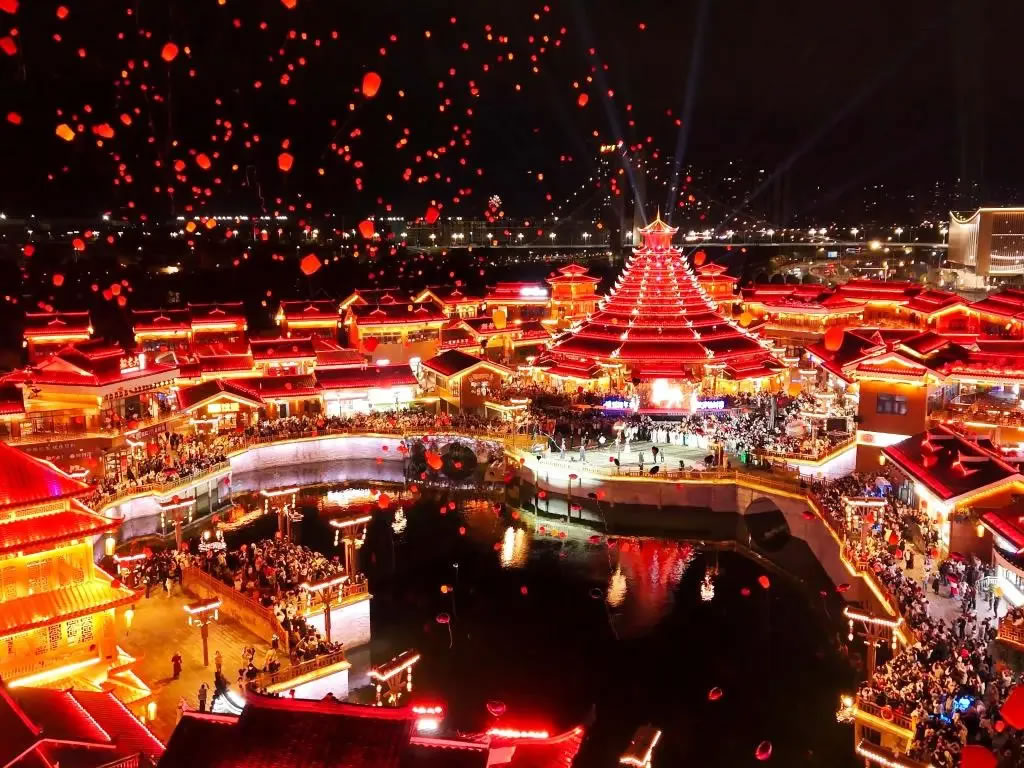 臨近午夜,榆樹灣·青春廣場(chǎng)迎來全天氛圍最高潮,游客們?cè)诳酌鳠魺裘嫔蠈懴滦履暝竿诠ぷ魅藛T的指引下有序放飛。點(diǎn)點(diǎn)燈火隨風(fēng)飄蕩,與夜空融為一體,構(gòu)成“千盞飛燈映星河”的浪漫畫面。