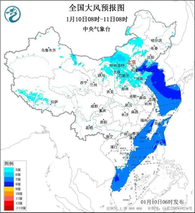 預(yù)計,1月10日08時至11日08時,西藏西部、甘肅北部、內(nèi)蒙古中東部、陜西北部、華北、山東、遼東半島等地部分地區(qū)有5~6級大風(fēng)、陣風(fēng)7~9級;渤海、渤海海峽、黃海大部海域、東海大部海域、臺灣海峽、臺灣以東洋面、巴士海峽、南海東北部和中部海域、南海西南部海域?qū)⒂?~8級、陣風(fēng)9~10級的大風(fēng)。