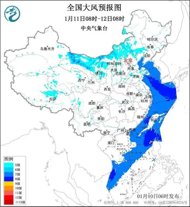 1月11日08時至12日08時,西藏中部、甘肅北部、內(nèi)蒙古中西部、寧夏北部、陜西西部、山西北部、河北北部、山東半島、遼東半島等地部分地區(qū)有5~7級大風(fēng)、陣風(fēng)8~9級;渤海、渤海海峽、黃海大部海域、東海大部海域、臺灣海峽、臺灣以東洋面、巴士海峽、南海東北部和中部海域、南海西南部海域?qū)⒂?~8級、陣風(fēng)9~10級的大風(fēng),其中臺灣海峽、巴士海峽、南海東北部的部分海域風(fēng)力可達(dá)9級、陣風(fēng)10~11級。