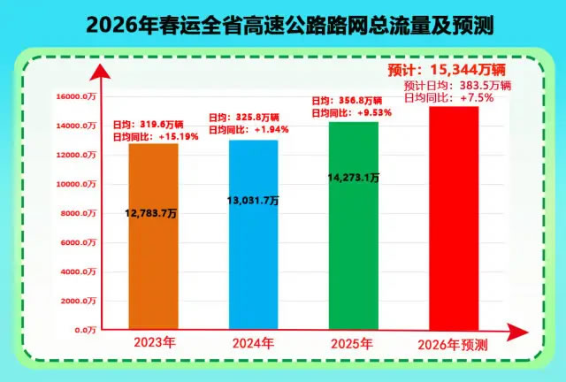 2026年春運(yùn)將于2月2日開(kāi)始,3月13日結(jié)束,共計(jì)40天。春節(jié)假期小型客車免費(fèi)通行時(shí)間為2月15日至2月23日。省高速公路路網(wǎng)運(yùn)行監(jiān)測(cè)指揮中心研判,春運(yùn)40天全省高速公路出入口總流量將達(dá)到15344萬(wàn)輛,較2025年春運(yùn)增長(zhǎng)7.5%;日均流量383.5萬(wàn)輛,為平日流量的1.6倍,車流總量有望創(chuàng)歷史新高。