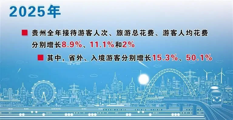 文旅市場(chǎng)的火熱,讓越來(lái)越多經(jīng)營(yíng)主體不斷跨界營(yíng)業(yè),在文旅行業(yè)創(chuàng)新前進(jìn),與傳統(tǒng)旅游經(jīng)營(yíng)主體一起推動(dòng)貴州旅游高質(zhì)量發(fā)展。日前,記者從貴州省2025年經(jīng)濟(jì)運(yùn)行情況新聞發(fā)布會(huì)獲悉,2025年貴州全年接待游客人次、旅游總花費(fèi)比上年分別增長(zhǎng)8.9%、11.1%。另?yè)?jù)省文旅廳數(shù)據(jù),省外、入境游客分別增長(zhǎng)了15.3%、50.1%。