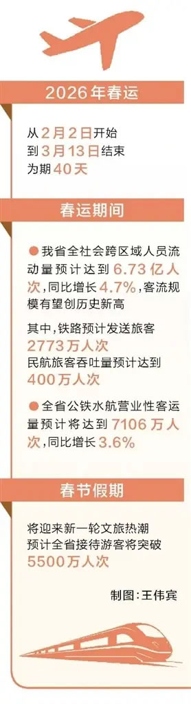 2026年春運從2月2日開始,到3月13日結束,為期40天。今年春節(jié)是個“大年”,共有9天假期,預計群眾返鄉(xiāng)、探親、旅游的出行意愿將更加強烈。春運期間,預計我省全社會跨區(qū)域人員流動量達到6.73億人次,同比增長4.7%,客流規(guī)模有望創(chuàng)歷史新高,其中鐵路預計發(fā)送旅客2773萬人次,民航旅客吞吐量預計達到400萬人次。