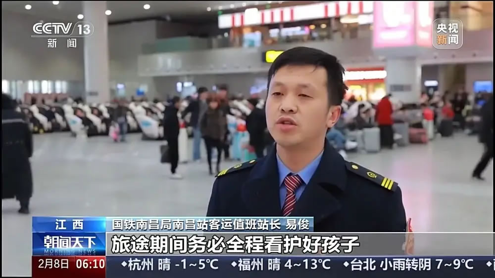 國(guó)鐵南昌局南昌站客運(yùn)值班站長(zhǎng) 易俊:旅途期間務(wù)必全程看護(hù)好孩子,切勿讓孩子脫離視線。如需幫助,可聯(lián)系車站工作人員和民警,謹(jǐn)防孩子走失、接觸陌生人員。