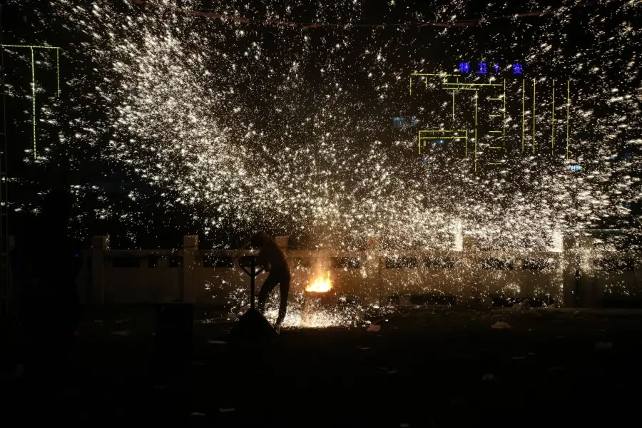夜幕降臨,非遺打鐵花表演率先登場。匠人們將滾燙的鐵水奮力擊打,萬千金花在夜空綻放,形成“火樹銀花不夜天”的壯觀景象。這門千年技藝承載著人們對(duì)風(fēng)調(diào)雨順、國泰民安的美好祈愿。