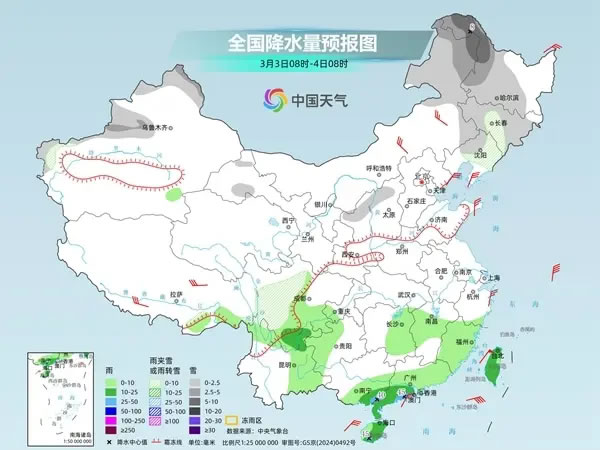 明天,內(nèi)蒙古東北部、東北地區(qū)大部、新疆北部、川西高原等地部分地區(qū)有小到中雪或雨夾雪,內(nèi)蒙古東北部、黑龍江西部等地部分地區(qū)有大雪;西藏東南部、西南地區(qū)東部、江南中西部和南部、華南中南部、臺灣島等地部分地區(qū)有小到中雨,廣西東南部沿海、廣東西南部、海南島西南部等地部分地區(qū)有大雨。