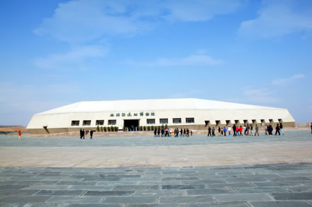水洞溝遺址博物院,它的外形仿水洞溝出土的名為石核的石器建造而成,建筑面積4308平方米,水洞溝遺址博物院以雕塑、展板、投影、文物展出以及講解的形式,可以了解人類進化的起源、水洞溝文化的興起以及水洞溝遺址五次考古發(fā)掘的過程與成果,同時,還有12分鐘的動態(tài)演出,讓我們實景體驗三萬年前原始人生產、生活以及面臨山洪暴發(fā)、山崩地裂的災難時被迫遷徙的場景。