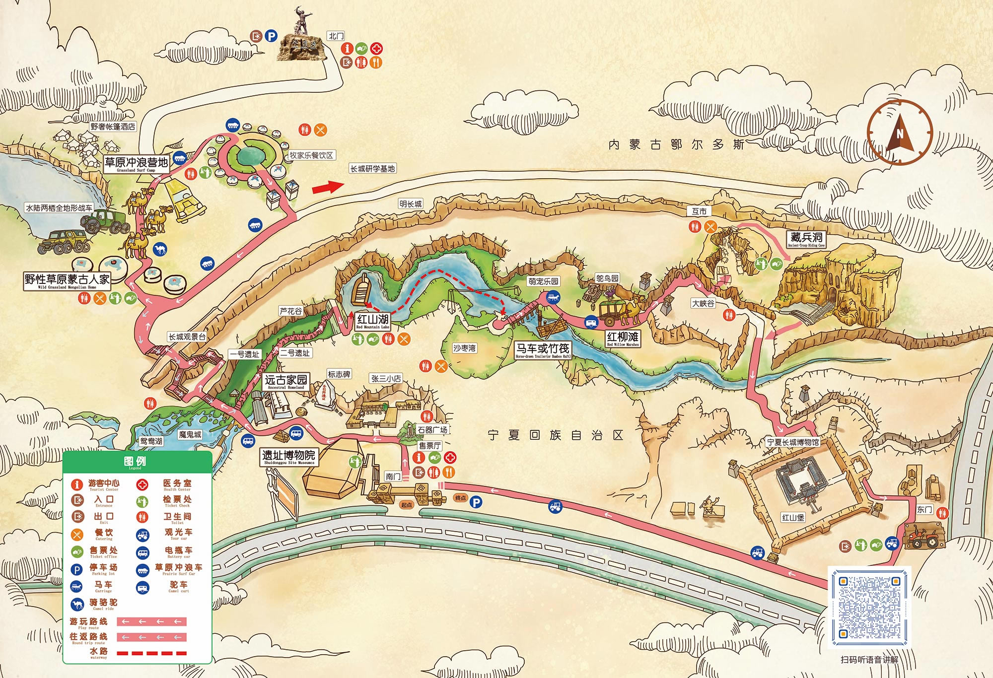 乘船蕩漾的紅山湖中,可以觀看水岸長城,體驗人與水鳥和諧共處;長城、斷崖倒映水中;藍天白云,映于水底的別樣番情趣。這種天人合一,歷史文化和當今生態(tài)有機結合的塞上江南景觀,實是不可多得,真可謂“舟行碧波上,人在畫中游”。