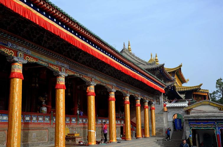 又稱文殊菩薩殿,為漢式硬山頂建筑,面闊九間,進深三間,面積592平方米。初建于明萬歷二十年(公元1592年),清雍正十二年(公元1734年)擴建。廊柱為藏式朱色八楞柱。整座大殿以三間為一單元,由北向南分別為獅子吼佛殿、文殊殿和宗喀巴殿。花寺又稱祈壽殿,建于清康熙五十六年(公元1717年),系一獨立的小庭院,殿為兩層重檐歇山頂建筑。柱頭梁枋都飾以飛禽、走獸、花卉、文紋,院墻飾琉璃磚雕。殿內(nèi)供奉釋迦牟尼、十六羅漢和四大金剛等塑像。