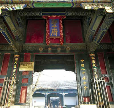 孔府位于曲阜城的中心,坐北朝南,迎面是一個(gè)粉白的大照壁,門前左右兩側(cè),有一對(duì)2米多高的圓雕雌雄石獅。紅邊黑漆的大門上鑲嵌著狻猊鋪首,大門正中上方的高懸著藍(lán)底金字的“圣府”匾額,門兩旁明柱上,懸掛著一對(duì)藍(lán)底金字對(duì)聯(lián):與國咸休安富尊榮公府第,同天并老文章道德圣人家。這副對(duì)聯(lián)相傳是清人紀(jì)均的手書。文佳字美,形象地說明了孔府在封建社會(huì)中的顯赫地位。這副對(duì)聯(lián)口氣之大自不待言,發(fā)人深思的是上聯(lián)“安富尊榮”的富字,下聯(lián)“文章道德”的章字,從上圖可以看出,“富”字上少了一 點(diǎn),“章”字中多了一筆,意思是說衍圣公官職位列一品,田地萬