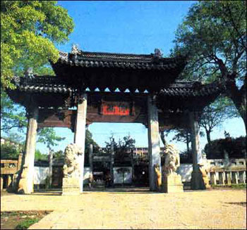 孟子對孔子有過這樣的評價:“孔子之謂集大成。集大成者,金聲而玉振之也。金聲也 者,始條理也;玉振之也者,終條理也”!敖鹇暋、“玉振”表示奏樂的全過程,以擊鐘(金聲)開始,以擊磐(玉振)告終。以此象征孔子思想集古圣先賢之大成,贊頌孔子對文化的巨大貢獻。因此,后人把孔廟門前的第一座石坊命名為“金聲玉振”。