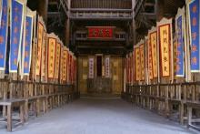 忠義堂院落里,中央是一根朱紅色的旗桿,上面懸掛著一面杏黃旗,-“替天行道”四個(gè)黑色大字。忠義堂前的平臺兩側(cè),又有兩桿粉色的大旗,東面的旗幟上是“山東呼保義”,西邊懸掛的是“河北玉麒麟”。