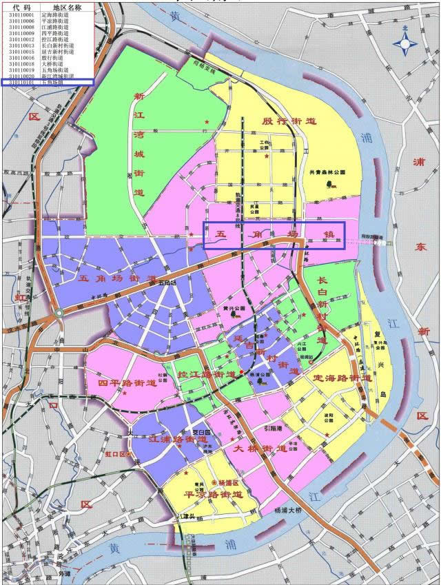 楊浦區(qū)轄12個(gè)街道:定海路街道、平?jīng)雎方值、江浦路街道、四平路街道、控江路街道、長(zhǎng)白新村街道、延吉新村街道、殷行街道、大橋街道、五角場(chǎng)街道、新江灣城街道、長(zhǎng)海路街道
