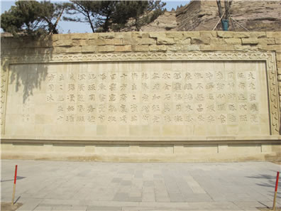 位于云岡石窟一窟山門前的“比丘尼曇媚造像記”石刻,為公元503年(景明四年)的題記。此碑刻有文字110個,再現(xiàn)了當時的社會背景,表達了發(fā)愿人比丘尼曇媚對佛教的高度信仰與虔誠以及希望佛教振興發(fā)展的愿望,文筆優(yōu)美,堪稱佛教發(fā)愿文之最。此碑也向我們展示了北魏時期一種特有的字體。因這種字體在當時多用于碑文,所以后人稱它為魏碑體。魏碑字體外方內(nèi)圓、拙樸有力,是隸書向楷書過渡的字體。由此看來,魏碑書法應(yīng)是北魏平城時的創(chuàng)造。原物很小,只有30厘米高,28厘米寬,于1956年20窟前考古發(fā)掘,現(xiàn)存于云岡博物館中。