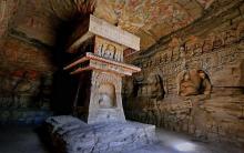 在風化殘破的第14窟中,正壁為一佛二菩薩主像,除下層龕像為晚期補刻外,中上層龕像大致有計劃雕鑿。后室東西壁分作三層:上層以盝形龕交腳菩薩為主體,內(nèi)側(cè)有一小坐佛圓拱龕;中層為較大、較深的坐佛圓拱龕,龕外兩側(cè)為三層出檐閣樓塔;下層深龕仿佛雕刻了帷幔,東壁為坐佛,西壁龕內(nèi)未完成即被改刻。整個洞窟設(shè)計嚴謹、雕刻精美。