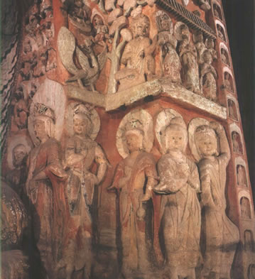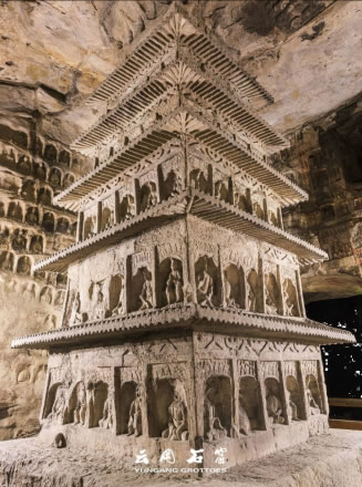 洞窟內(nèi)三級方形浮屠塔居中,塔面上刻出瓦筒、檐椽、斗拱等仿木建筑構(gòu)件,層層瓦壟出檐,上層四角鏤空雕刻八角棱柱,形成了周匝回廊,為研究北魏建筑提供了實物依。