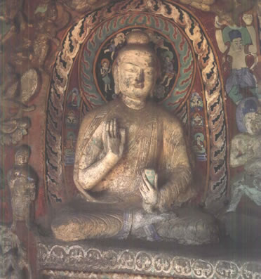 第19窟主佛像結(jié)跏趺坐,佛像耳輪齊肩,下頜崩毀,著袒右肩袈裟,輕薄貼體,衣紋簡潔明快。佛像右手舉胸施無畏印,左手掌心向上握法衣于膝上,以表達佛法的無畏與傳承?咄鈻|西耳洞中,各雕刻一尊倚坐佛像,西耳洞佛像,耳廓寬大垂肩,體魄挺拔勁健。這種分窟安置三世佛的布局設(shè)計,既有變化,又顯莊嚴,是北朝石窟形制的新創(chuàng)舉。