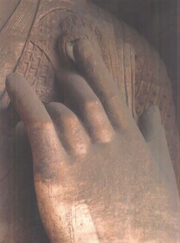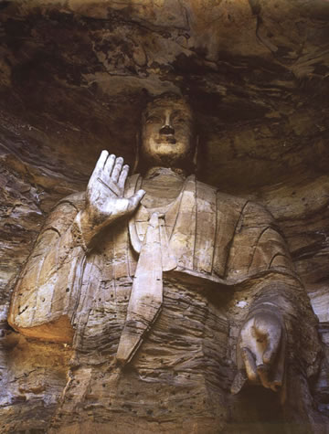 大佛兩側(cè),原本各有立佛、立菩薩,呈三世佛、五尊像布局,可惜今天僅有東壁一佛獨立。東立佛高約9.5米,磨光肉髻,圓臉大耳,深目高鼻,著通肩式佛衣;右手舉在胸前,施無畏印,左手握衣角下垂,跣足立于蓮臺之上。其衣紋雕刻與造像特征,極具西域藝術(shù)神韻。西壁立佛,大約當年與東立佛相對侍立,但早已坍塌無形,現(xiàn)在僅殘留圓形頭光和赤裸的雙足及其蓮臺。