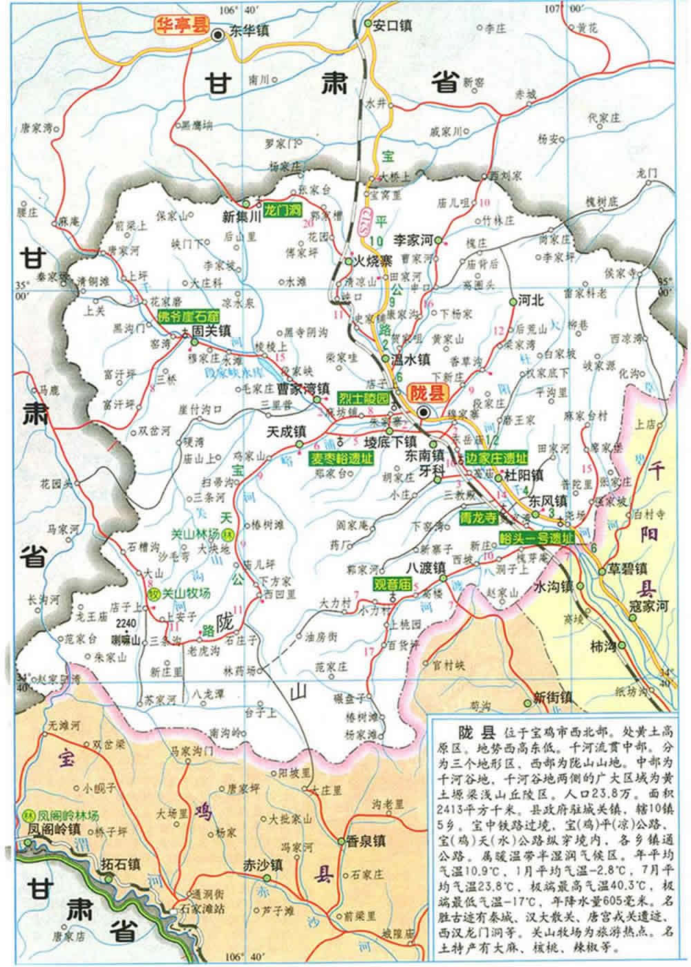 隴縣,史稱(chēng)隴州,因地處隴山東阪而得名,是陜西省西部的一個(gè)邊陲縣。東臨千陽(yáng),南接陳倉(cāng),西北部與甘肅清水、張家川、華亭、崇信、靈臺(tái)五縣毗鄰。版圖面積 2418平方公里,轄10鎮(zhèn)5鄉(xiāng)1個(gè)管委會(huì),158個(gè)行政村,1000個(gè)村民小組,總?cè)丝?5.03萬(wàn),其中農(nóng)業(yè)人口22.27萬(wàn)。寶中鐵路和204省道貫穿全境,為陜、甘、寧“三省通衢”和邊貿(mào)重鎮(zhèn)。