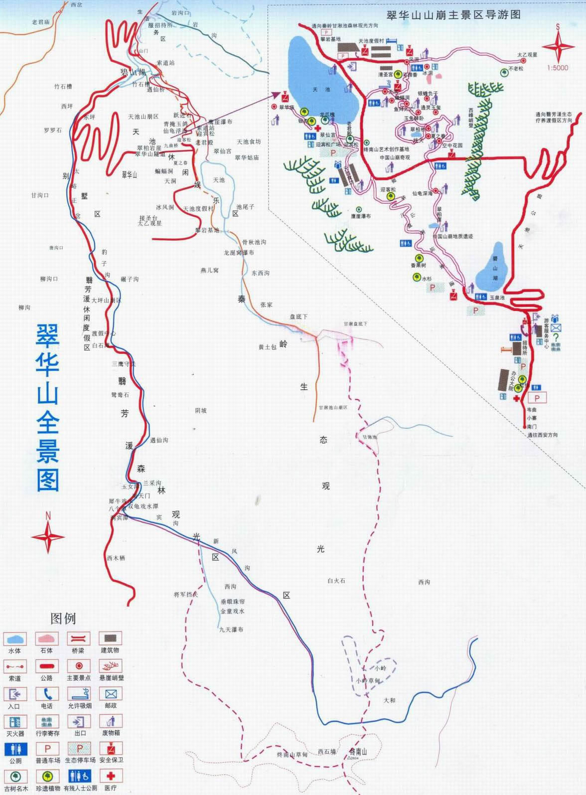 翠華山秀美的湖光山色和其國內罕見的山崩地貌使翠華山以“終南獨秀”和“中國地質地貌博物館”著稱。翠華山高峰環(huán)列,峭壁聳立,險不可攀,中有一天然水池,稱“天池”,又稱“太乙池”或“龍移湫”,池水面積約5萬平方米。湫池群山環(huán)峙,碧波蕩漾,清明如鏡,纖塵不染。池南的太乙殿,是舊時遇旱祈雨之所。還有呂公洞、黃龍洞,池北的冰洞、風洞、八仙洞等。冰洞在盛夏仍堅冰垂凌,風洞則四季寒風颼颼。冰洞東南有飛流直下的瀑布。