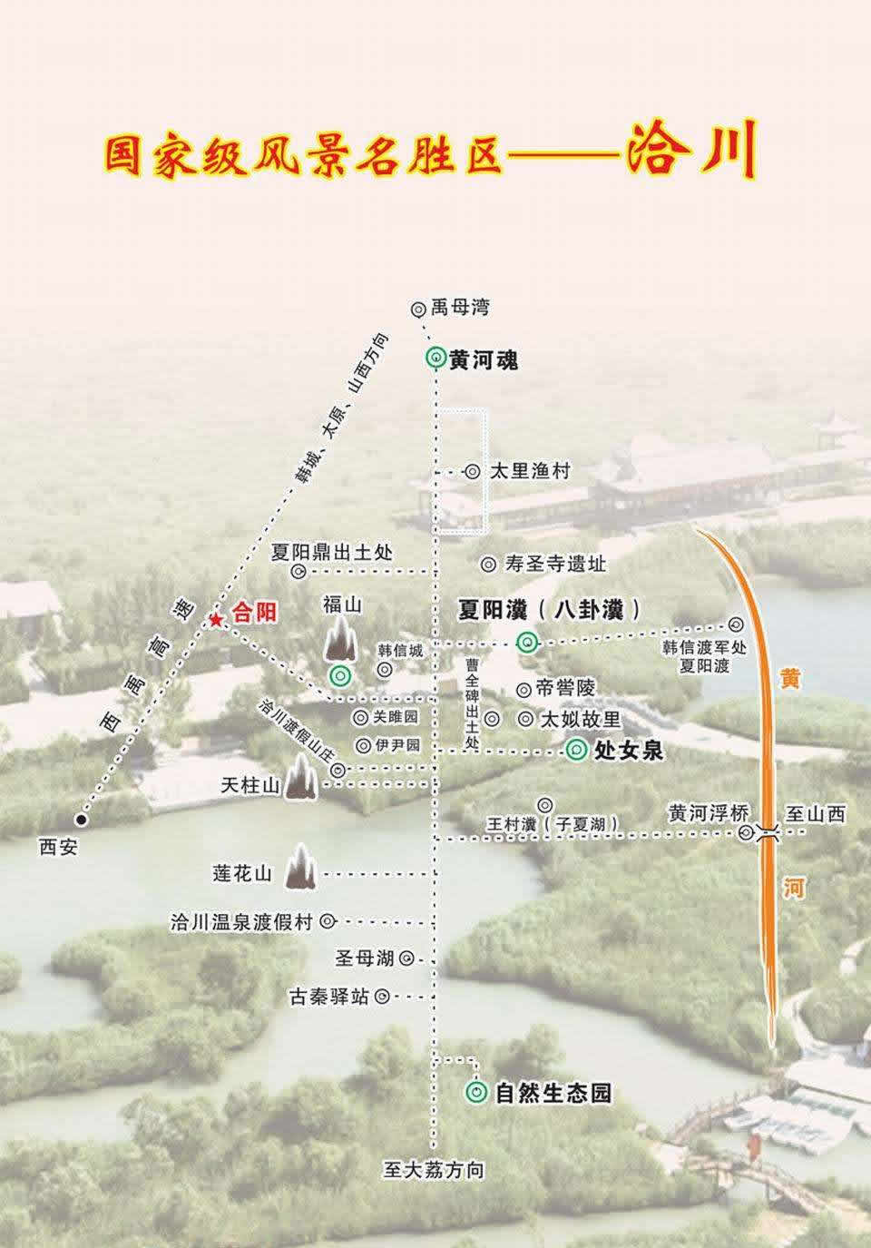 1995年經(jīng)陜西省政府批準設立的洽川風景名勝區(qū),2004年被列為國家級風景名勝區(qū),堪稱中華一絕。景區(qū)位于縣城以東20公里的黃河西岸,面積176平方公里。景區(qū)內(nèi)有黃河流域最大的蘆葦蕩(10萬畝)和最大的濕地保護區(qū)(15萬畝),白天鵝、丹頂鶴、黑鸛、大鴇等百余種國家一、二級保護動物在此棲息。景區(qū)的7處瀵泉天下獨有,其中"處女泉"最為神奇,人入水不沉,泉涌沙動,如綢佛身,如沙浪浴,是名符其實的"華夏一絕"。"萬畝蘆蕩,千眼神泉,百種珍禽,十里荷塘,一條黃河,秦晉相望",是洽川風景名勝區(qū)的真實寫照。觀洽川景,游處女泉,住農(nóng)家院,享農(nóng)家樂,擁抱母親河已成國內(nèi)外游客的神往。