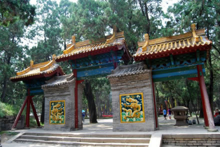 神道盡頭便是陵區(qū)。陵園四周順依山勢,修有綿亙不絕的青磚圍墻,高1.6米,涂以紅色,象征至尊至偉。墻頭為紅椽綠瓦,古色古香。整個陵園,南北約210米,東西約72米。