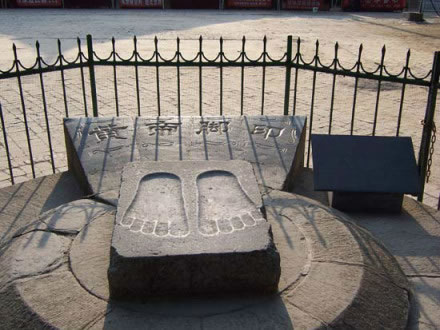 整塊石頭約一平方米。青石面上,鐫刻有黃帝腳印一雙。民間有向黃帝腳印投硬幣或零錢以測運氣的習俗,據(jù)說投向腳印大拇趾運氣最好,為大吉大利。