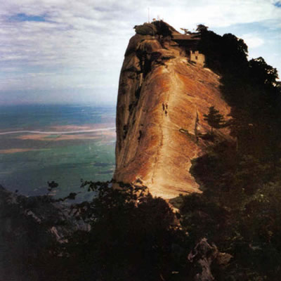 西峰海拔2082米,華山主峰之一,因位置居西得名。又因峰巔 有巨石形狀好似蓮花瓣,古代文人多稱其為蓮花峰、芙蓉峰。袁宏道在他的《華山永》中記述:“石葉上覆而橫裂”;徐霞客《游太華山日記》中也記述:“峰上石聳起,有石片覆其上,如荷花。”李白詩中有“石作蓮花云作臺”句,也當(dāng)指此石。