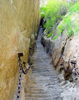 “老君犁溝”同千尺幢、百尺峽一樣,是登華山的必經(jīng)險道之一。今在犁溝的右上方,鑿成271個石級,兩旁鐵鏈下垂,行走較為安全。