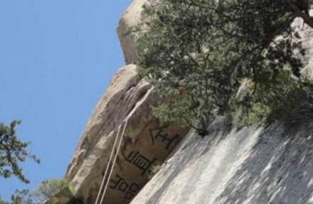 關(guān)于全真巖各類史志書籍記載頗多。《三才圖會》載:“靜室旁有巖,高數(shù)十丈,遙覆其室,并書‘全真巖’三字!薄度A岳圖經(jīng)》中記述,全真巖三字每字大約七八尺高,鐫刻在那樣一個地方,除過能騰云駕霧的神仙,凡夫俗子肯定是辦不到的。明書畫大家王履的《南峰記》中記述得列為形象:巖好像一個彎腰人的頭部,遠(yuǎn)遠(yuǎn)遮蓋住腹部的石室。倒坎巖頂端鐫“全真巖”三字,并涂以紅色。世上沒有神仙,刻字肯定是人類所為,但在這樣特殊的位置,上不可上,下不可下,除非懸浮于空中才能可能。古人是如何做到這一點(diǎn),迄今無解。