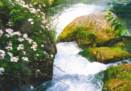 距峽口三公里,兩塊五噸大小的巨石上生長著兩棵樹,其中較粗的一棵樹是名貴植物金錢槭,國家重點保護(hù)樹種;較細(xì)的那顆名叫毛紫薇。兩棵樹根生扎于堅石之中,傲然屹立。
