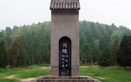 茂陵位于陜西省咸陽市興平市東北,東西為橫亙百里的“五陵原”。西距興平市12千米,東距咸陽市15千米。其北面遠依九嵕山,南面遙屏終南山。茂陵是漢武帝劉徹的陵寢,是漢代帝王陵墓中規(guī)模最大、修造時間最長、陪葬品最豐富的一座,被稱為“中國的金字塔”。茂陵于建元二年(前139年)至后元二年(前087年)間建成,歷時53年。陪葬墓有李夫人、衛(wèi)青、霍去病、霍光、金日磾?shù)热说哪乖帷?/p>