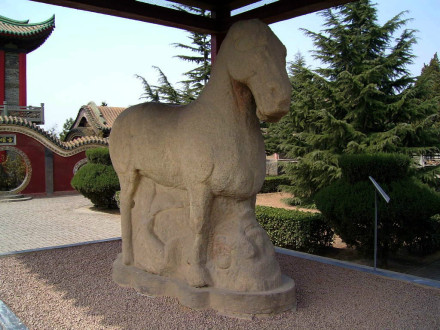 茂陵的群雕獸像、人獸相博的藝術(shù)造型,是漢武帝留在茂陵的十分珍貴的重大文化遺產(chǎn),空前啟后的“國之瑰寶”,是兩千多年前漢文化遺產(chǎn),是中國大型雕刻的鼻祖,是中國迄今發(fā)現(xiàn)時代最早、體積最大、保存最完整、最具有藝術(shù)價值的大型石刻群,在十四件造像巨雕作品中有十二件被國家文物局鑒定為“國寶”。中國美術(shù)家協(xié)會主席劉開渠,著名作家賈平凹以及前輩文史大師郭沫若等,都曾對其有“嘆為觀止”的贊賞。特別值得指出的是,這批巨雕中的“馬踏匈奴”、“躍馬”、“起馬”,最受歷代學(xué)者和游人的推崇,并認為這些“馬”的作品,可能出自漢武帝的授意。漢武帝癡愛寶馬,天下聞名。在中國歷史上,為能得到寶馬、良駒而出詩作的皇帝,漢武帝是第一人。