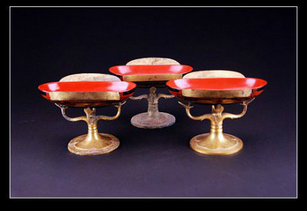 1981年5月茂陵一號無名冢南出土,整體分為座、杯上下兩部分,座為盤足,柿蒂狀支架,承托耳杯。酒杯平面呈橢圓形,圓形底,兩側(cè)附耳,紋飾華美,漆工與鎏金皆精湛,是研究西漢工藝美術(shù)史的珍貴實物資料。