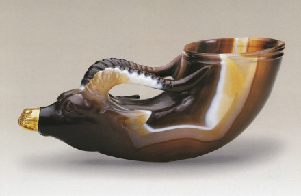 酒器,長15.5厘米,口徑5.9厘米。鑲金獸首瑪瑙杯選材精良,巧妙利用玉料的俏色紋理雕琢而成。杯體為角狀獸首形,獸雙角為杯柄。嘴部鑲金帽,眼、耳、鼻皆刻劃細微精確。從選材、設(shè)計到工藝,都可稱為唐代玉雕藝術(shù)的精品,是迄今發(fā)現(xiàn)唐代唯一一件俏色玉雕,是唐代玉器做工最精湛的一件,也是唐代中外文化交流的產(chǎn)物。
